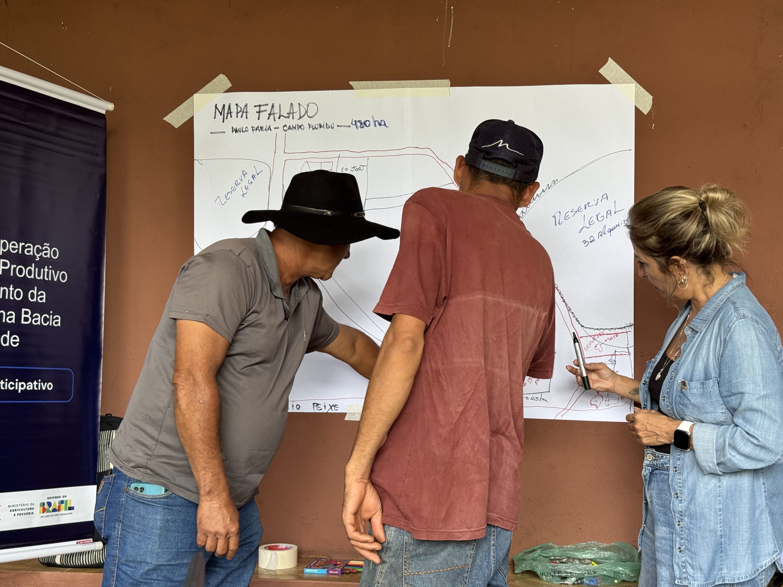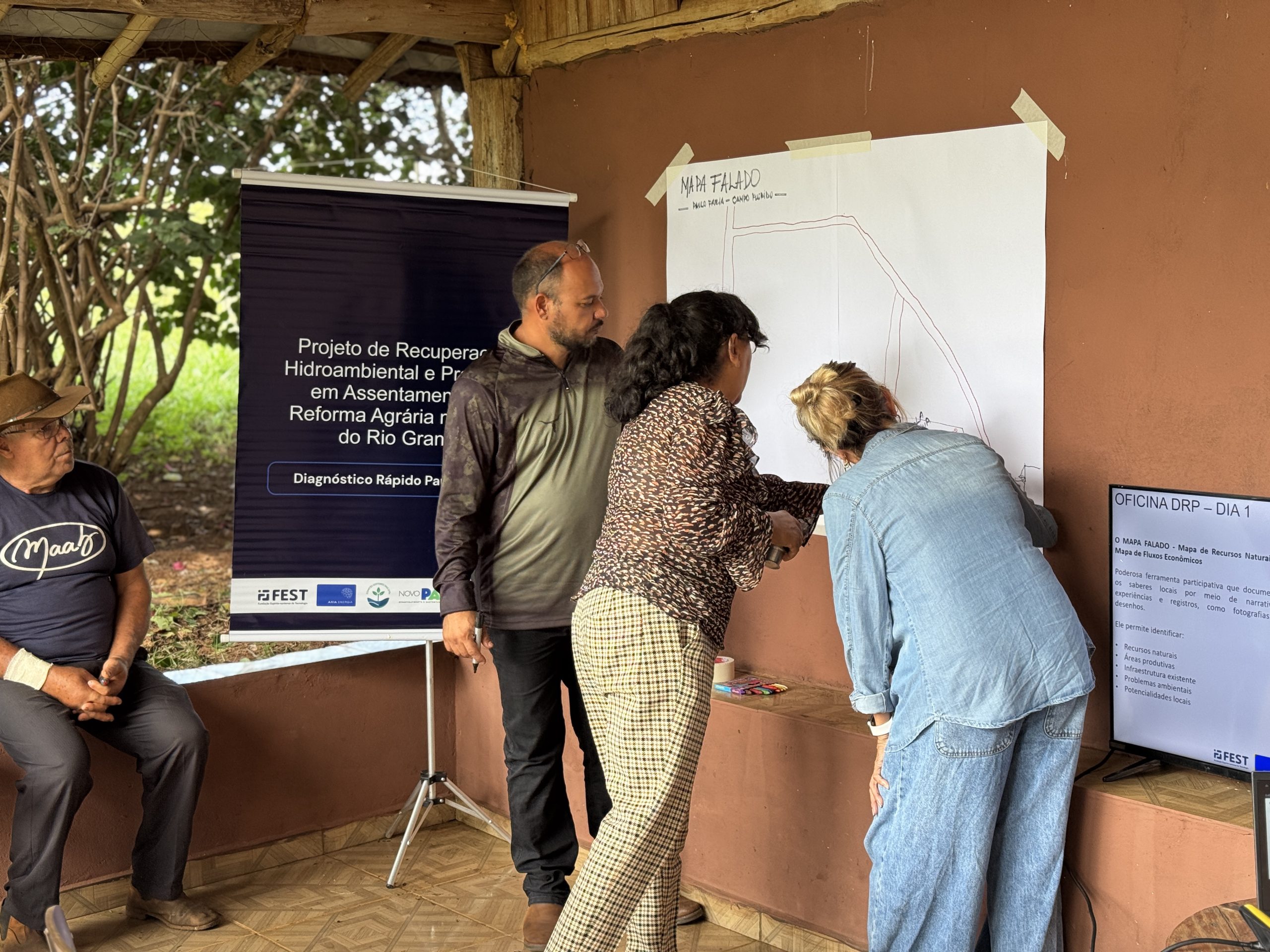 - Mapa Falado – atividade em que os próprios assentados representam graficamente o território, identificando recursos naturais, áreas degradadas, infraestruturas, conflitos de uso da terra e potencialidades locais, permitindo uma leitura coletiva do espaço onde vivem e produzem;